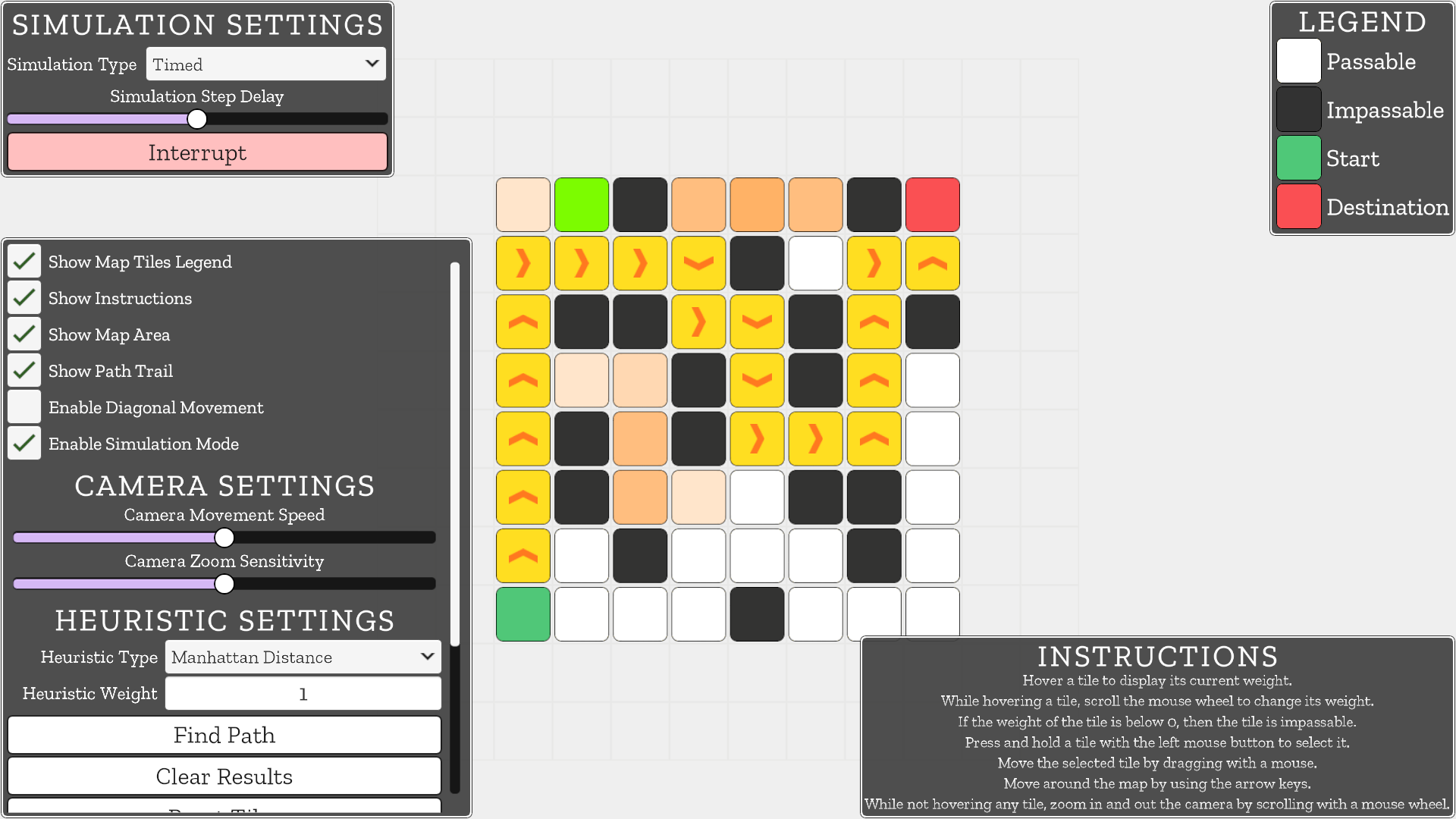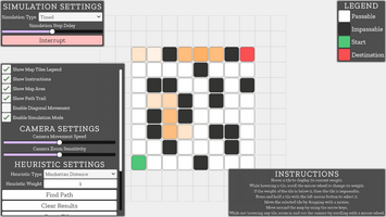 Enjoy the working of A* algorithm on a 2D map with editable tiles and many adjustable settings!